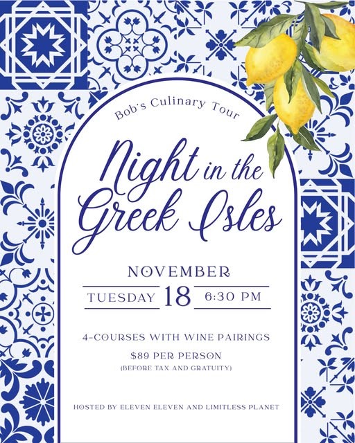 Please join Robert “Bob” Colosimo and Limitless Planet Founder & CEO, Shannon Lichti for an evening of tasting, savoring, and discussing our upcoming trip to Greece in June 2026.